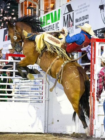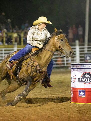 One of the fastest-moving events at the Dayton Rodeo will be cowgirls barrel racing, a race against time as cowgirls run highly-trained horses around three barrels in a cloverleaf pattern. This equine athlete must run full speed, check himself and make a 360-degree turn around a barrel, then run hard again to the next barrel. Barrel racing requires extreme precision, as winners are often decided by a mere thousandths-of-a-second.
